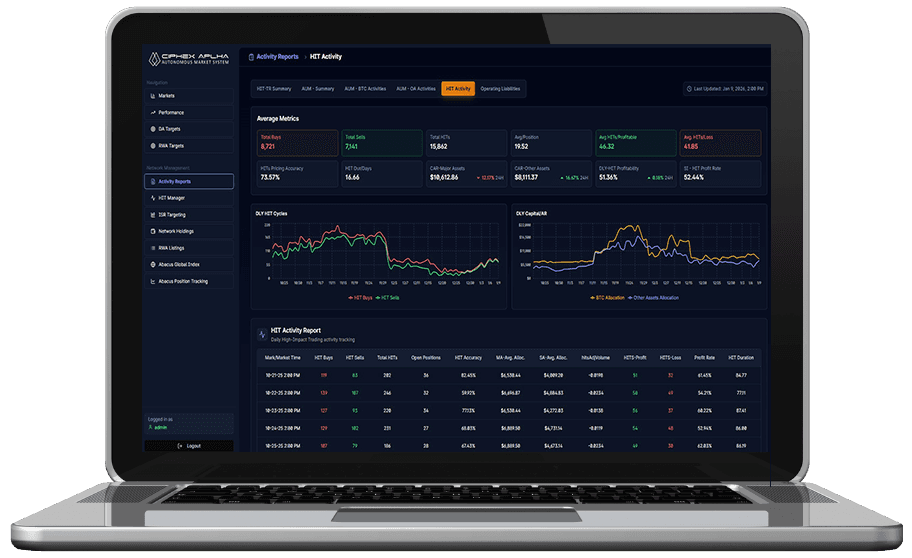 Built on the proprietary Abacus I AMS/EMS architecture, the system evaluates price dynamics and market inefficiencies across a broad digital asset universe. Disciplined analysis and repeatable execution are applied across short-duration time horizons, converting continuous market shifts into consistent, probability-driven outcomes.
