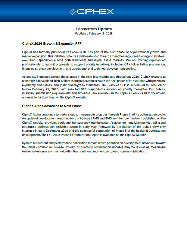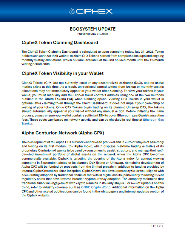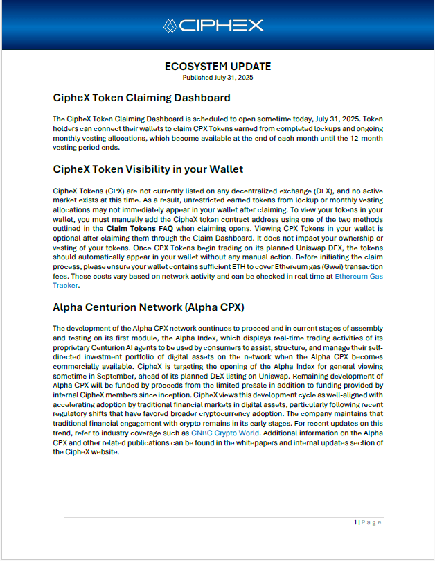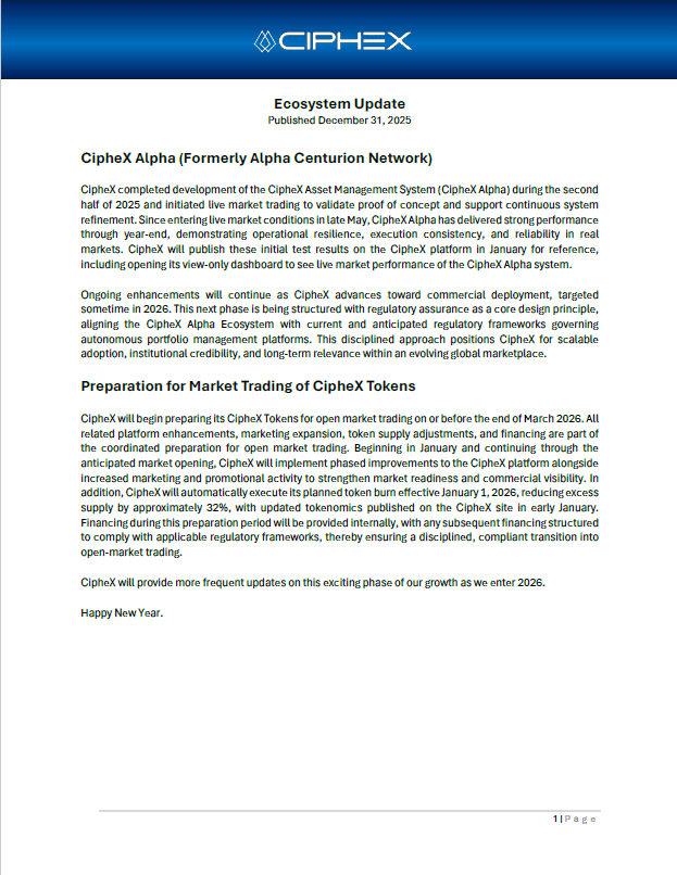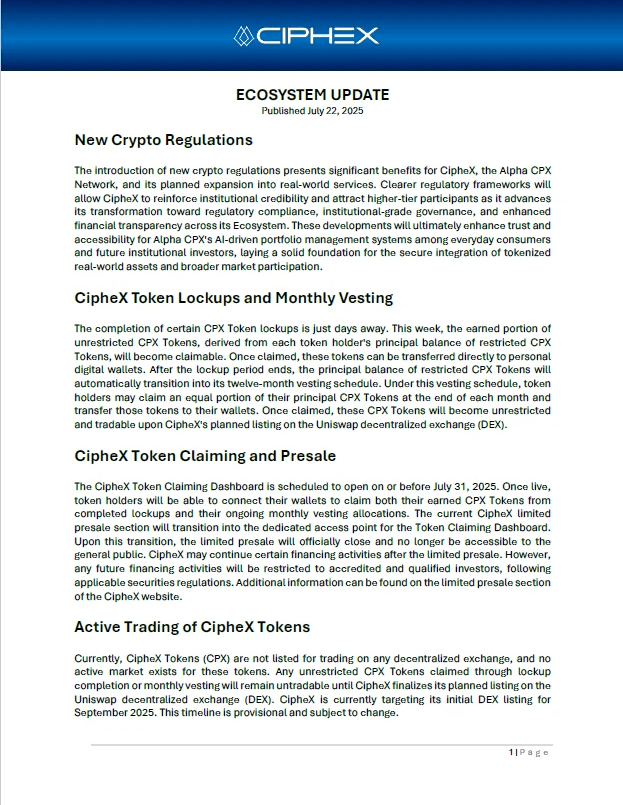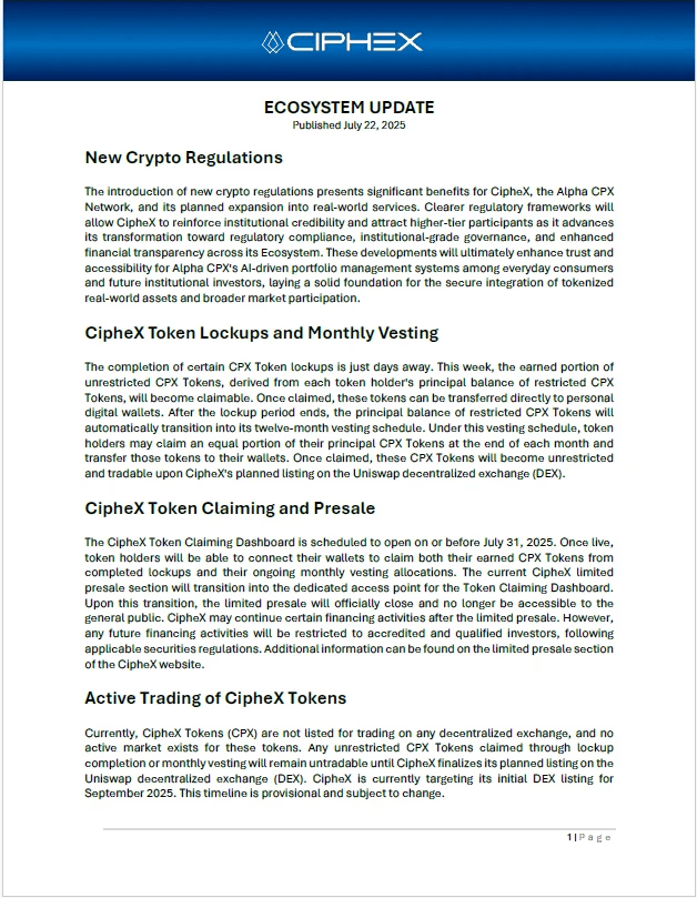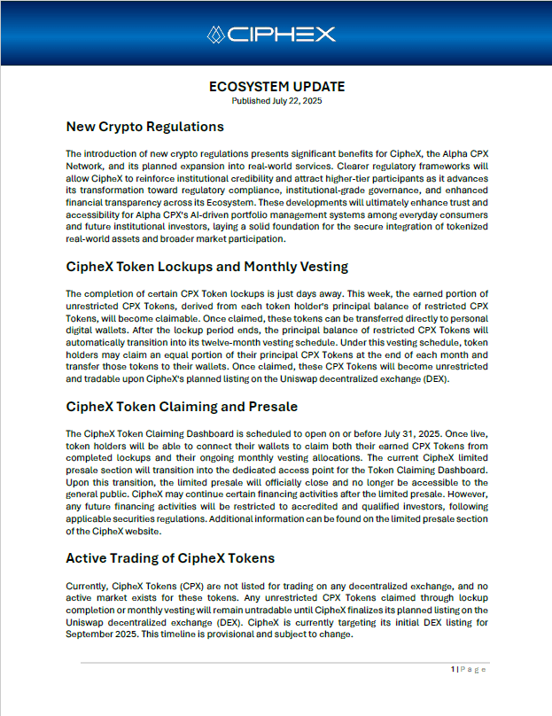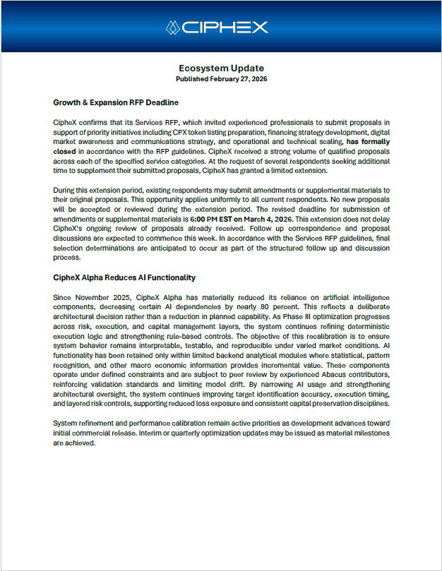 The information presented is provided solely for illustrative and informational purposes. Any descriptions of financial models, market strategies, planned consumer services, or outcomes may include forward-looking statements and are not guarantees of performance or availability. Nothing on this website constitutes an offer to sell, a solicitation of an offer to buy, or a recommendation to invest in any securities, digital assets, investment products, services, or financial instruments associated with the CipheX Alpha Network or the broader CipheX Capital ecosystem, collectively referred to as CipheX. No content should be interpreted as investment, legal, accounting, or tax advice. CipheX reserves the right to modify, update, or discontinue any information, services, or service features, policies, tokenomics frameworks, pricing structures, or operational guidelines at any time without prior notice. Any statements, representations, or materials not issued directly by CipheX, Cipherion Capital SA, or duly authorized affiliates are unauthorized and expressly disclaimed. Past performance is not indicative of future results.