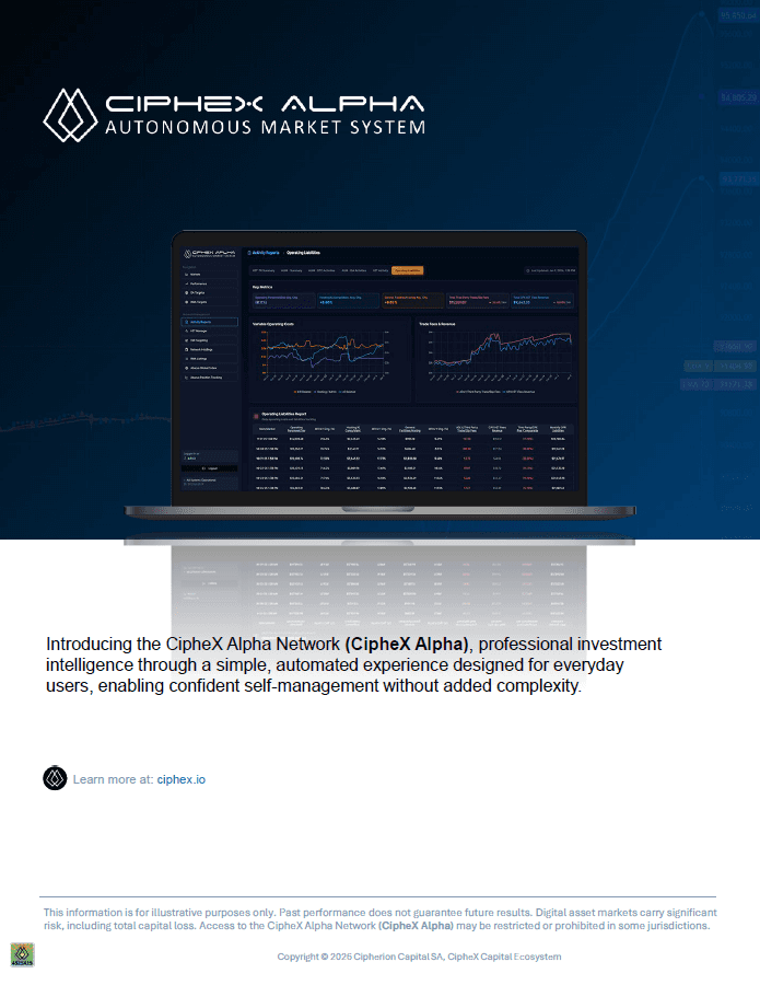 The information presented is provided solely for illustrative and informational purposes. Any descriptions of financial models, market strategies, planned consumer services, or outcomes may include forward-looking statements and are not guarantees of performance or availability. Nothing on this website constitutes an offer to sell, a solicitation of an offer to buy, or a recommendation to invest in any securities, digital assets, investment products, services, or financial instruments associated with the CipheX Alpha Network or the broader CipheX Capital ecosystem, collectively referred to as CipheX. No content should be interpreted as investment, legal, accounting, or tax advice. CipheX reserves the right to modify, update, or discontinue any information, services, or service features, policies, tokenomics frameworks, pricing structures, or operational guidelines at any time without prior notice. Any statements, representations, or materials not issued directly by CipheX, Cipherion Capital SA, or duly authorized affiliates are unauthorized and expressly disclaimed. Past performance is not indicative of future results.